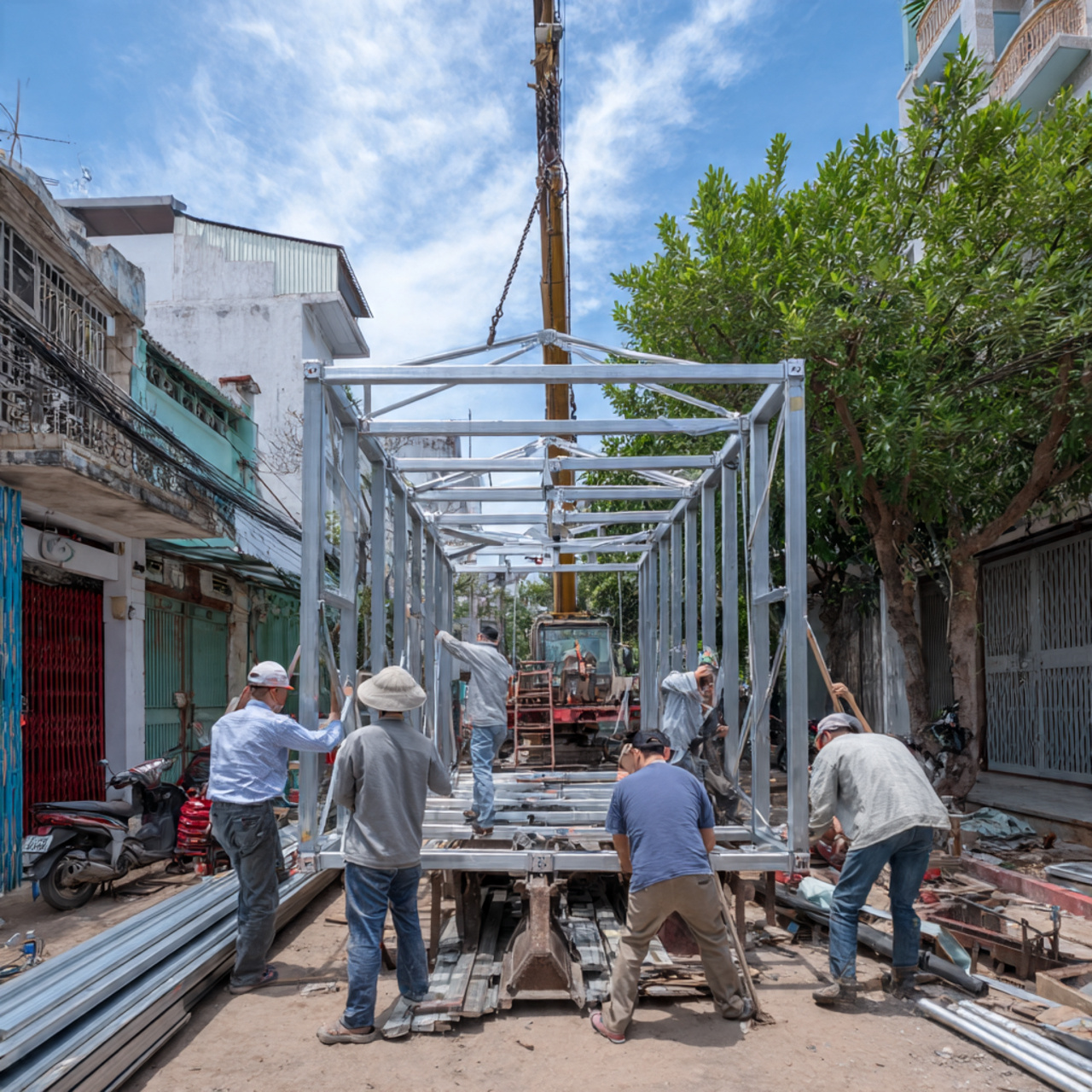 Hình 1: Quá trình dựng khung thép nhà lắp ghép tại TPHCM – Trần Nguyên